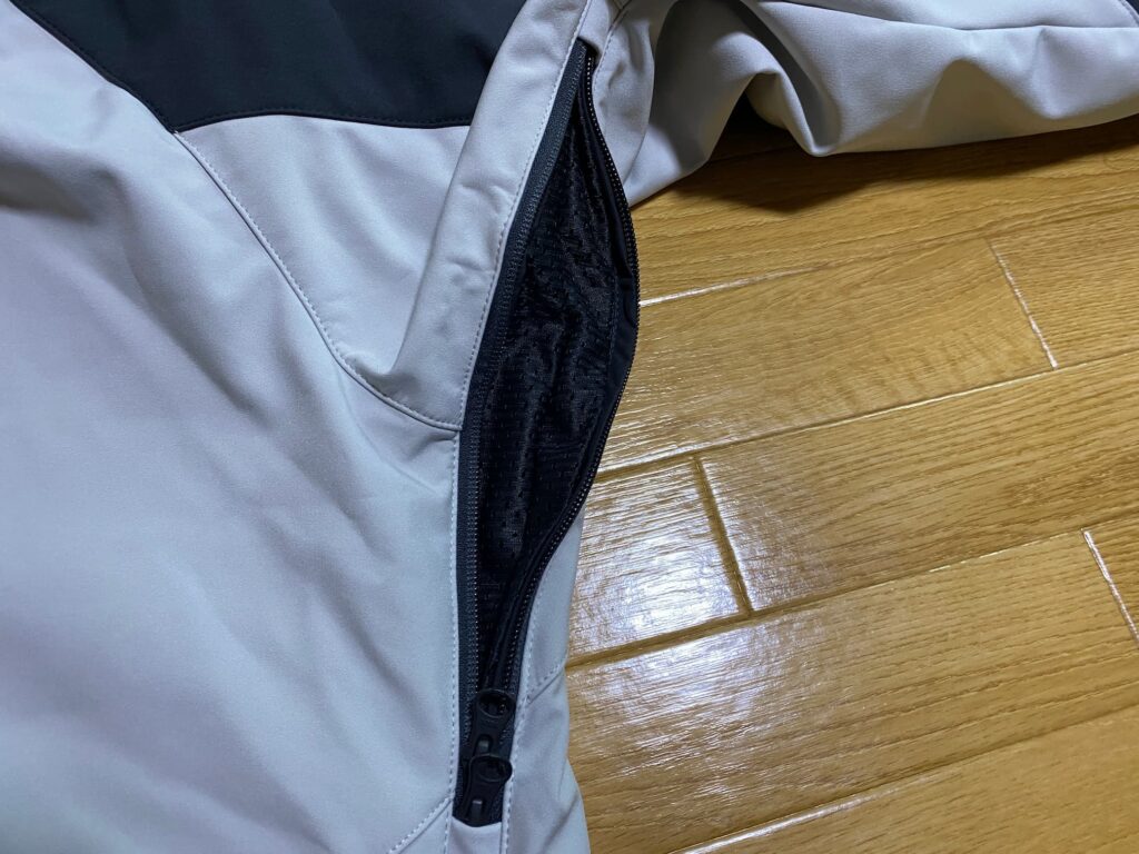 両脇にファスナーが配置されており、そこの開け閉めをすることで、脇の下から空気の通り道を作り、ジャケット内部の換気をすることができます。