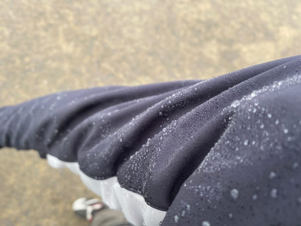 帰宅の最終走行で、ポツポツと雨が降り出し、雨天の中高速道路を走行することになりました。公式HPには明確な「防水」の記載はありませんでしたが、このジャケットにはちゃんと簡易的な撥水加工が施されています。