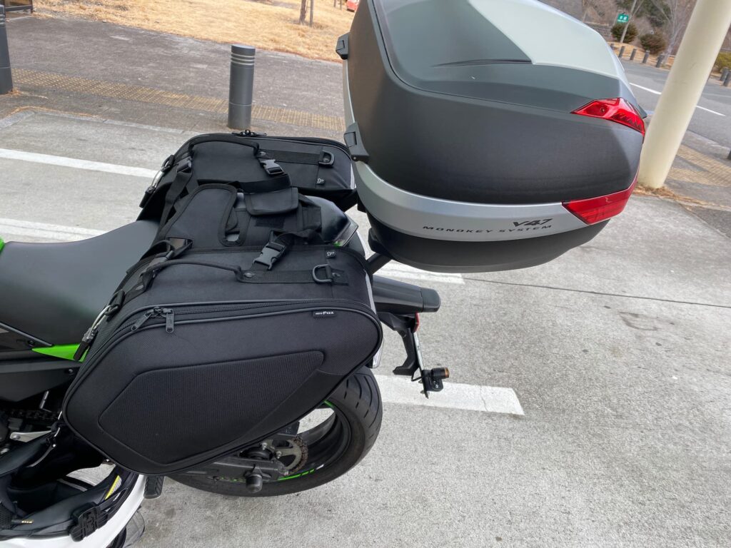 今回の積載は、GIVIのトップケース(V47N)とタナックスのサイドバッグ(MFK-281)の組み合わせ。トップケースは既にレビューしていますが、フルフェイスも収まる大容量と、雨や盗難への安心感は弾丸旅の必須条件です。