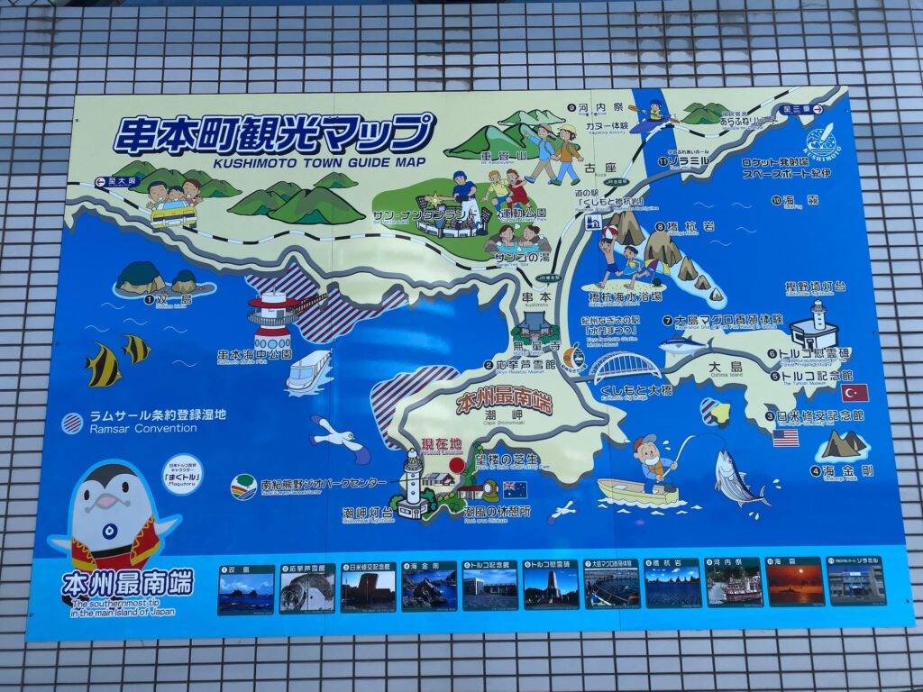 潮岬がある和歌山県串本町は、見どころが非常に多い場所。観光マップを見ると、有名な「橋杭岩」や「トルコ記念館」、さらにはロケット発射場まで。本来なら数日かけてゆっくり巡りたいスポットばかりです。