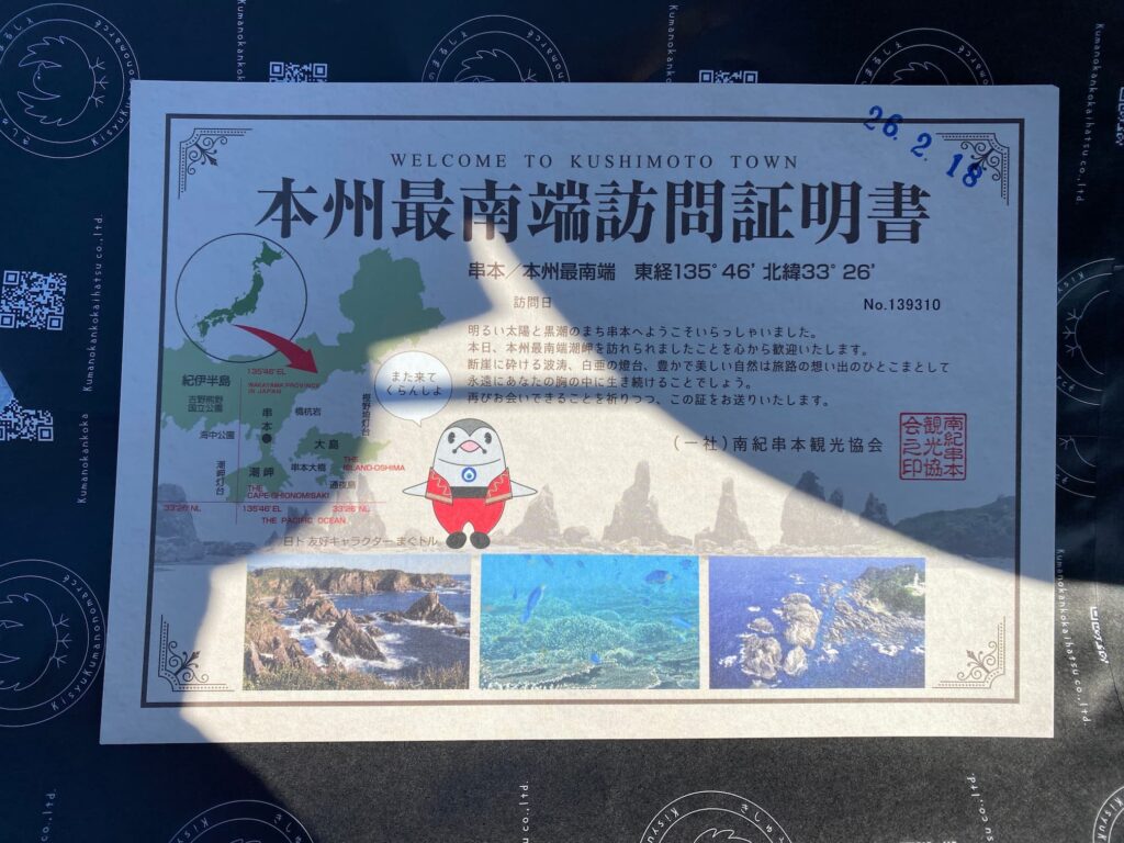 2日目の朝一番に訪れた潮岬では、大海原を横目に走る爽快な道が僕を迎えてくれました。本来であれば「潮岬観光タワー」で本州最南端訪問証明書を購入(ワター入館料とセットで300円)したかったのですが、あいにくの定休日。急遽、近くの「道の駅 くしもと橋杭岩」の売店へ向かい、無事に100円で証明書をゲットしました。